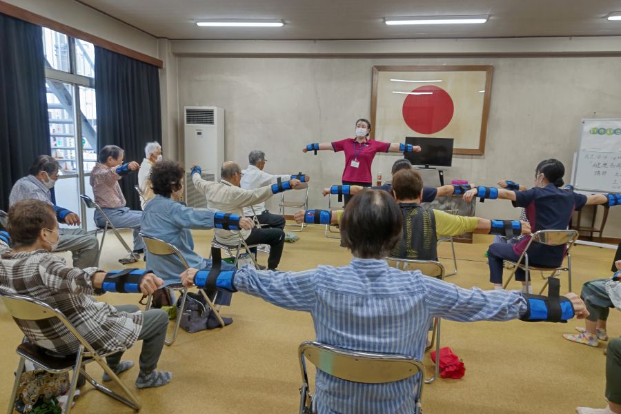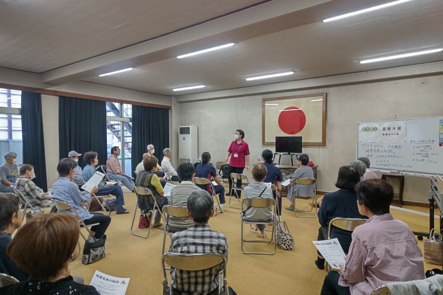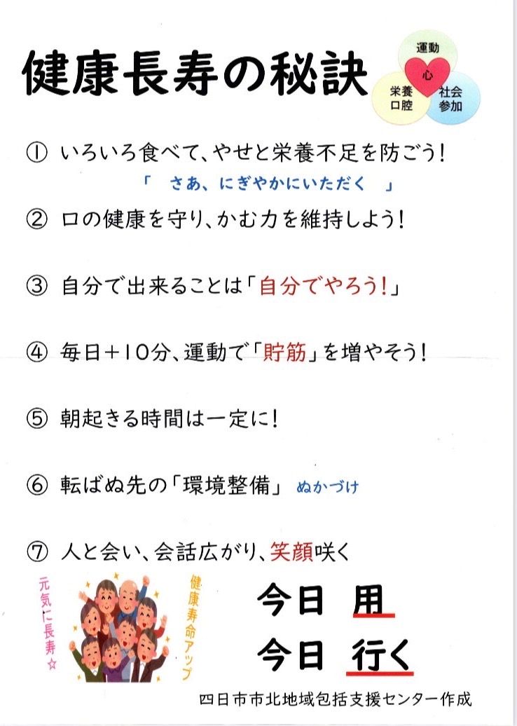 松原きらく会百歳体操グループは、令和7年10月14日(火)に松原公会堂において、四日市北包括支援センターの土田保健士さんにより「百歳体操」と「健康長寿の秘密」の勉強会を行いました。このグループは高齢者が健康で生きがいのある生活を過ごすため、平成29年2月から毎週火曜日の午後に活動を行っており、参加者の平均年齢は82歳程です。当日はきらく会会員25名と実習生の専門学校の学生さん3名でした。勉強会の中味は3枚目の写真のとおり、バランスの良い食事、適度の運動、規則正しい生活、人との交流など7項目に渡って具体的なお話がありました。参加者は自分に直結したテーマにつき、熱心にメモを取り話に聞き入っていました。勉強会を開催して非常に良かったと感じています。