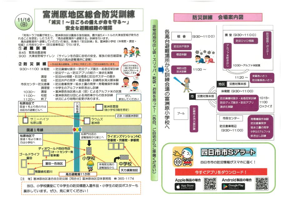 富洲原地区連合自主防災隊の発表した、総合防災訓練(雨天決行)の全体計画は下の図の通りです。各地区の高台避難後に小学校と市民センターで防災訓練を行います。お手数ですが見ずらいので、②防災訓練の項を拡大してお読みください。お友達や家族と一緒に防災を学ぶスタンプラリーも用意している模様です。ぜひ、参加して下さい。