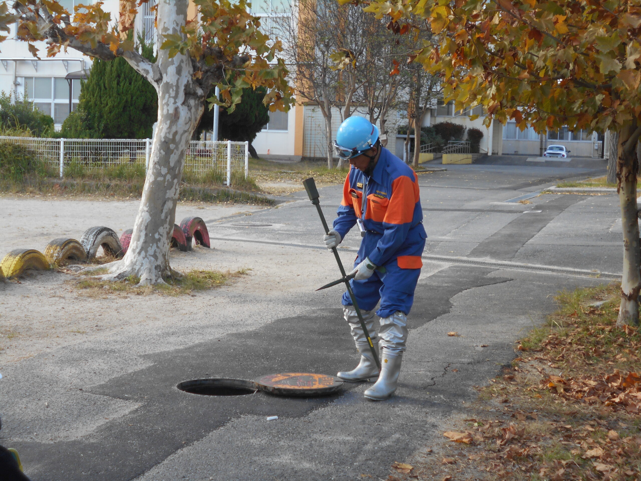 実際に放水を体験したり、消火栓のマンホールを開けて中がどうなっているか見学しました。