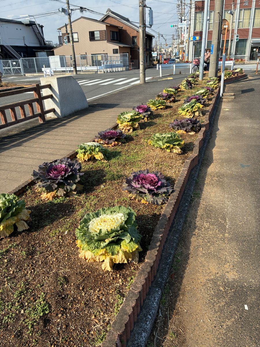 お正月が近づいて来ました。「海運橋花壇」に海運橋花いっぱいサークルの皆さんが植え付けたハボタン(葉牡丹)の様子を紹介します。これまで植えられていたアジサイを撤去し、雑草を取り除いて、写真のように紅白、紅白に植えられています。よくご覧下さい。寒さには強いけれども、冷たい風には弱い点が少し心配です。花ことばは 祝福 愛をつつむです。