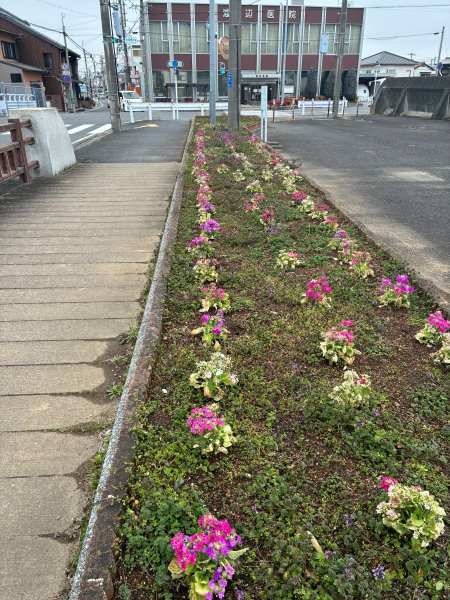 25日に、久しぶりに朝から雨が降り続いて、海運橋花壇に植栽されているサクラソウにとっても恵みの雨となり、さらに26日が暖かい陽気となりましたので、今朝みると、この間までの元気のなさとうって変わって生き生きしています。雑草もまた生き生きしてきました。春に向けて楽しみです。併せて歴史散歩ということで「かいうんはし」と表記された石柱を紹介します。